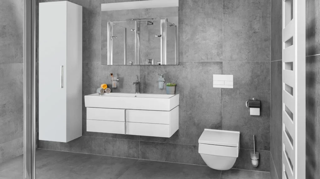 V naší galerii realizací sledujte primárně práci s odstíny šedé, bílou sanitou a integritu barev rámů i zapojení detailů. To rozhoduje o tom, jestli bude koupelna působit uceleně a svěže.