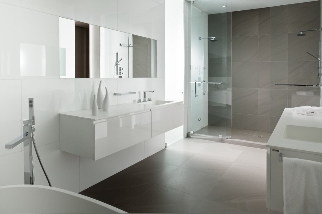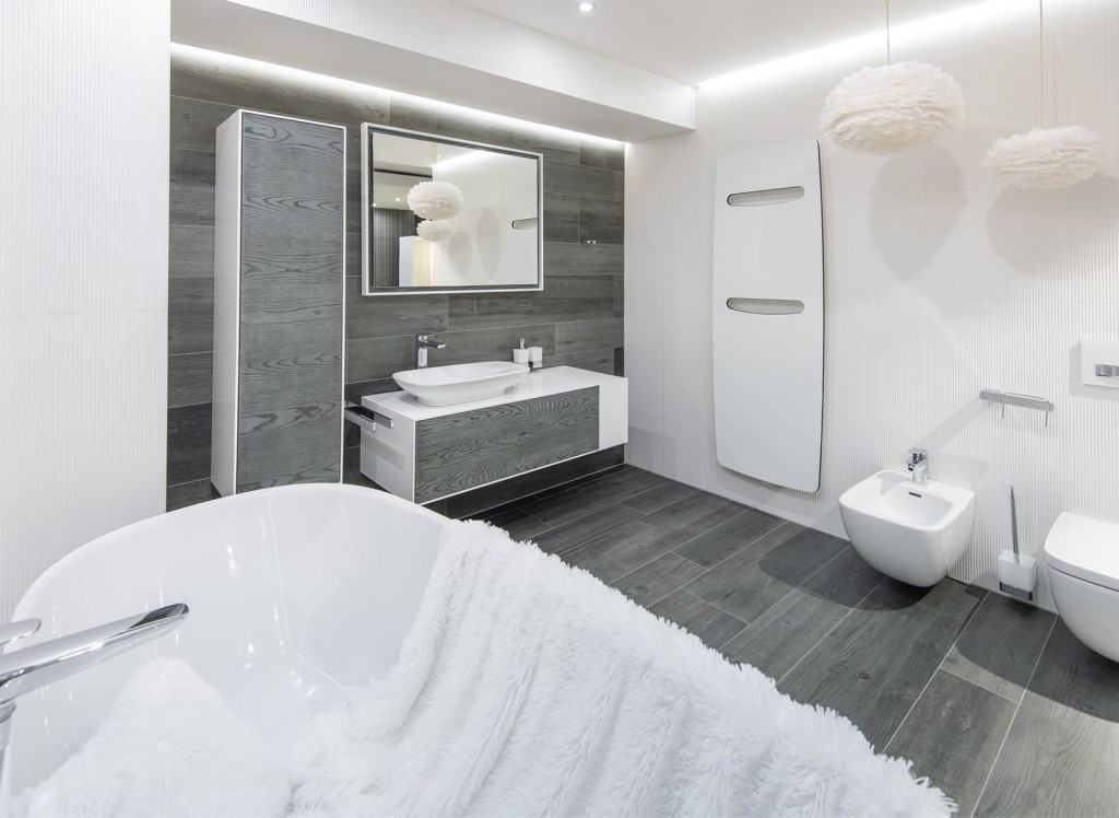 Prohlédněte si fotogalerii bílo-šedých koupelen a ujasněte si, jak poskládat odstíny spektra šedé s čistě bílou tak, aby koupelna působila čistě, moderně a přitom nebyla nudná. Doporučujeme držet jednotný design menších prvků (např. chromované rámy, baterie) a vyřešit světlo tak, ať je ho v koupelně dost.