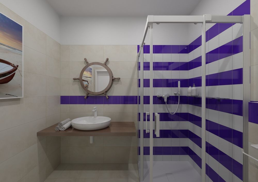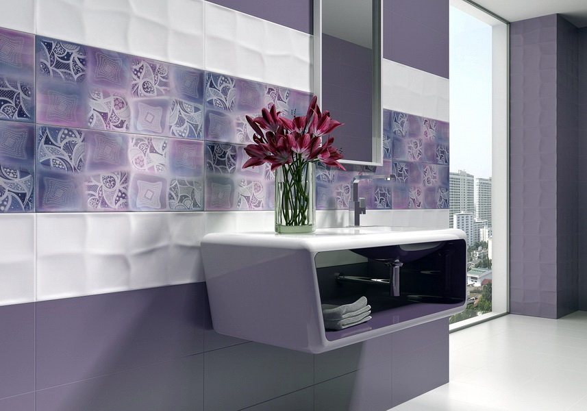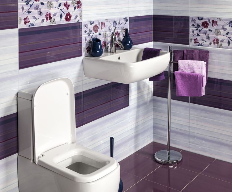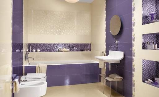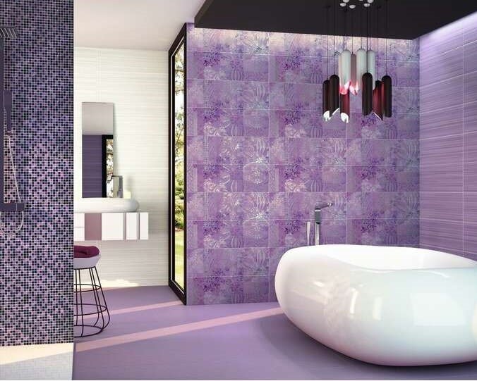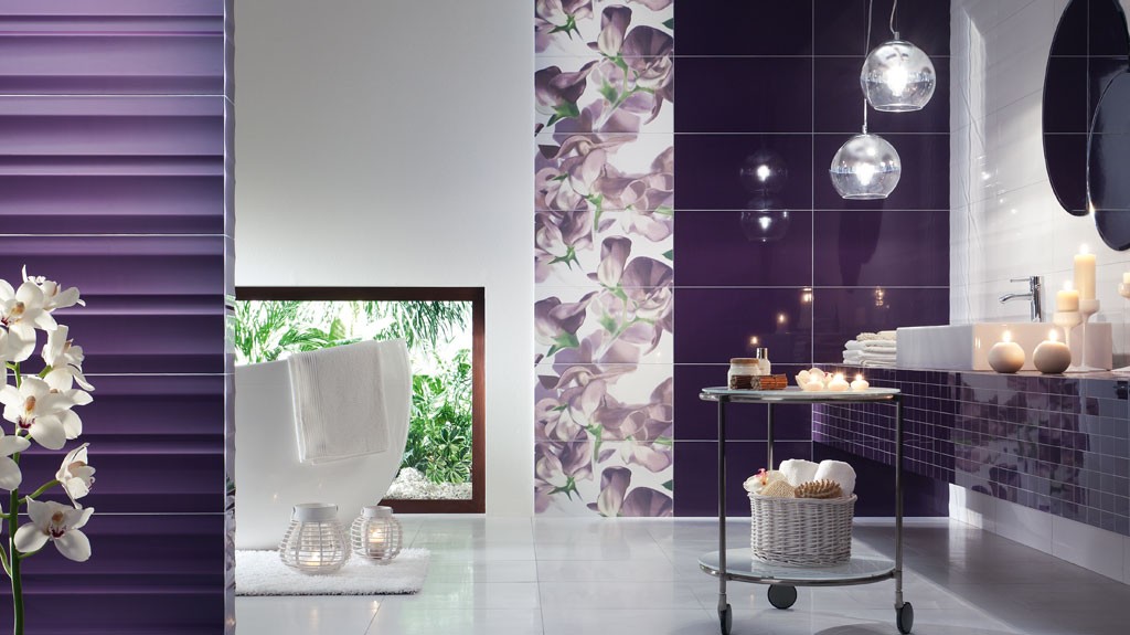 - fialová jako hlavní barva (obklady, stěna) nebo jako doplněk (textilie, dekorace),