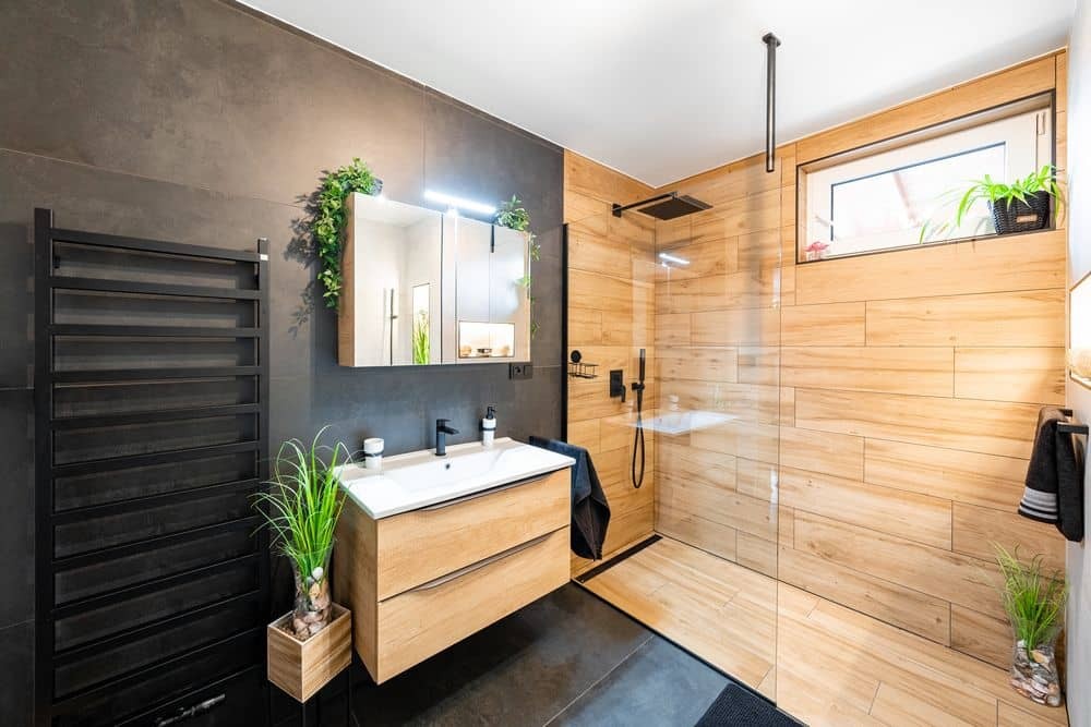- sprchový kout s černým rámem pro industriální/moderní styl,