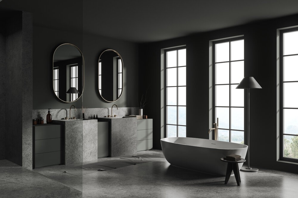 - tmavá umyvadlová deska a tmavý rám zrcadla,