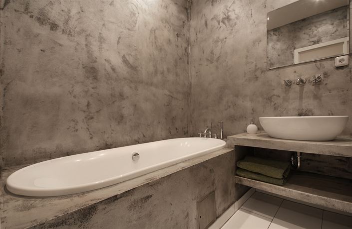 - betonová stěrka na stěnách nebo obklady v dekoru betonu,