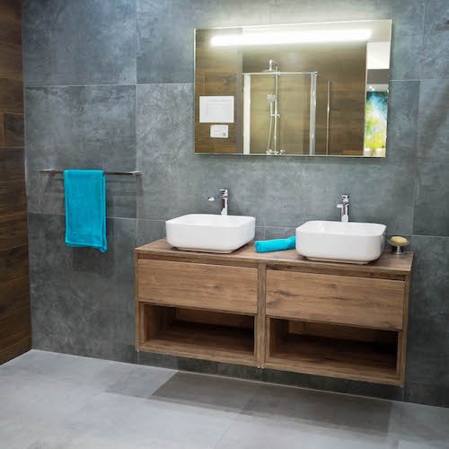 Při zařizování koupelny v dekoru betonu se držte jednotných tónů doplňků s kovem (např. černá u baterií, rámu zrcadla i madel skříněk). Kombinujte beton se zjemňujícím materiálem (např. dřevo), aby prostor nepůsobil příliš chladně. Rozjasnit ho můžete také kontrastní barvou výrazných ručníků.
