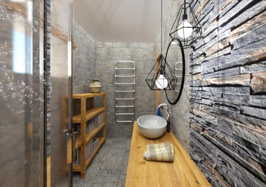 - koupelnový nábytek v dřevodekoru jako vyvážení kamene,
