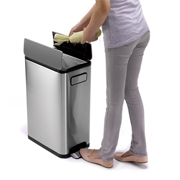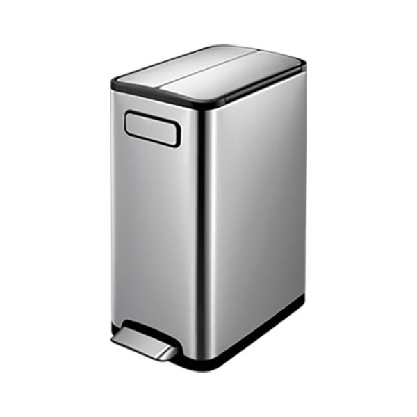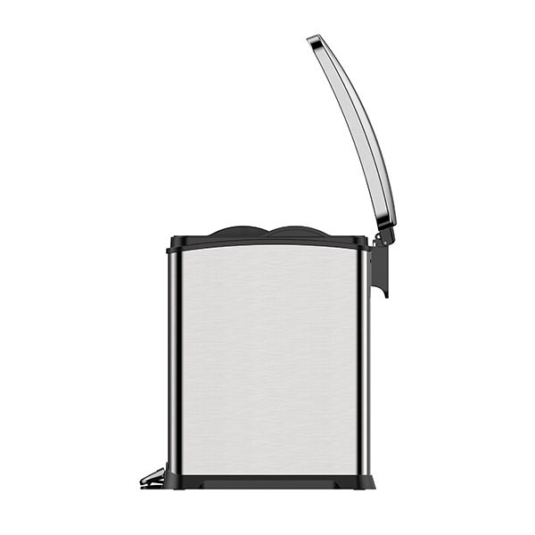 Pedálový odpadkový koš z ušlechtilé nerezové oceli s dvoukřídlým víkem šetřící prostor. Nerezová ocel disponuje povrchovou úpravou proti otiskům prstů. Koš obsahuje technologii Soft Close, která umožňuje tiché a plynulé dovírání obou vík. Navíc má funkci uzamčení obou vík v otevřené poloze a je vybaven výklopným uchem a kolečky pro snazší manipulaci.