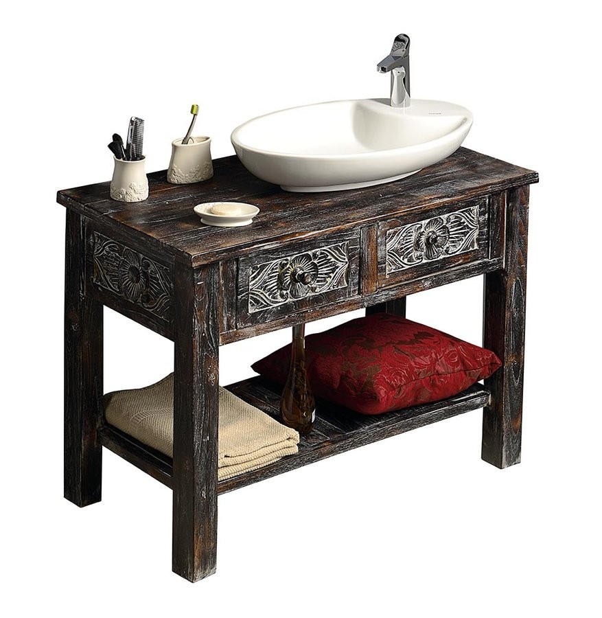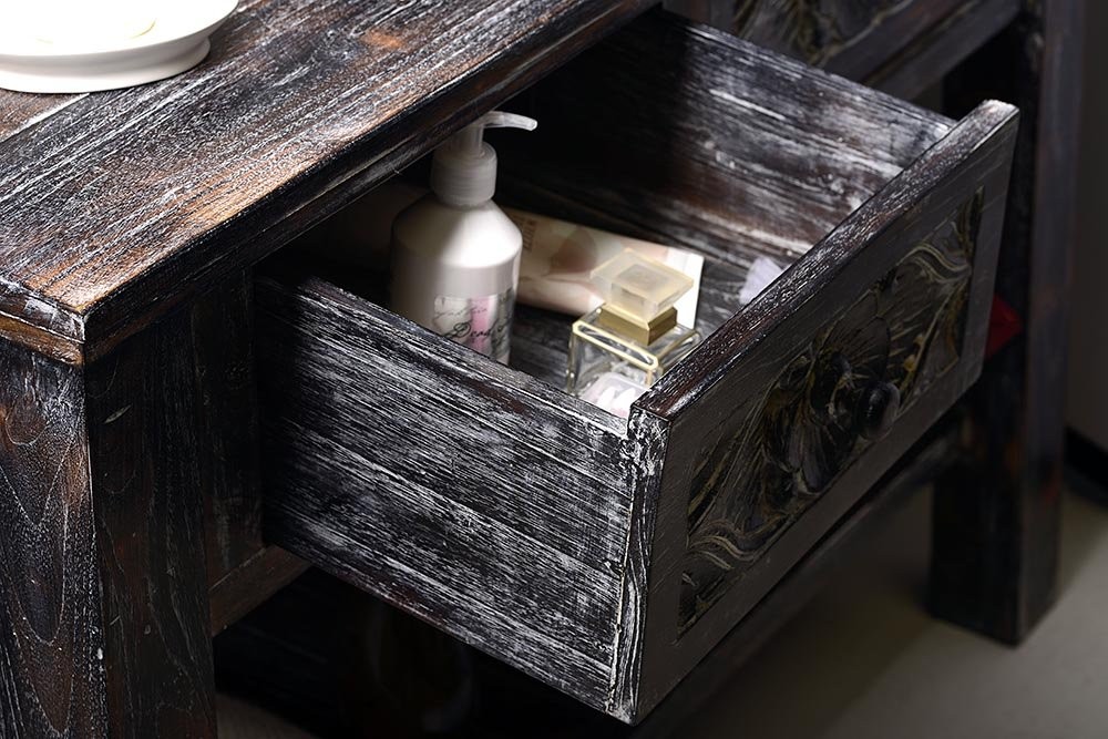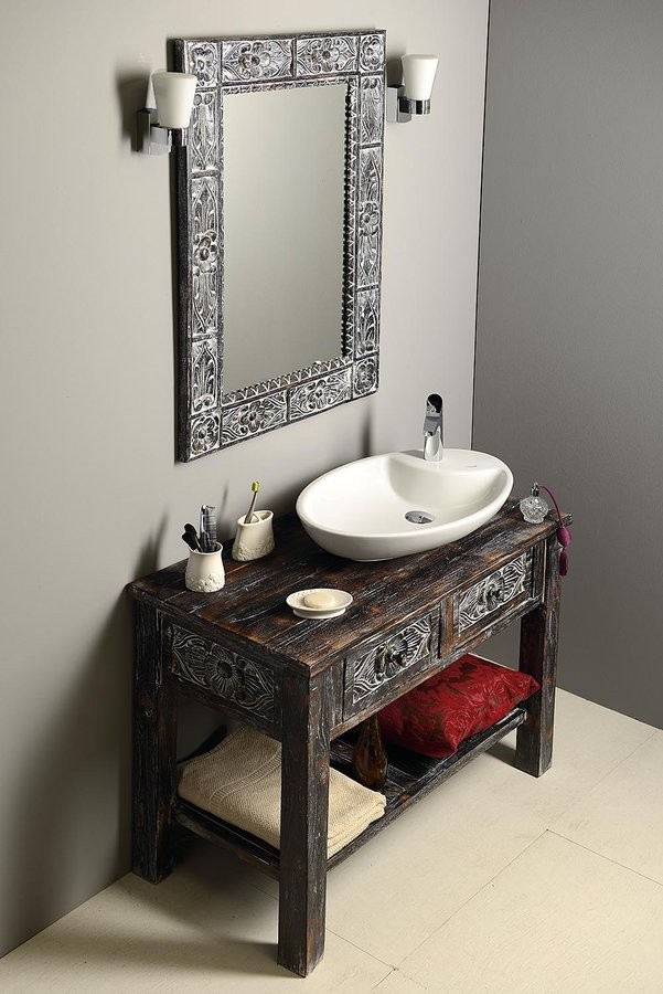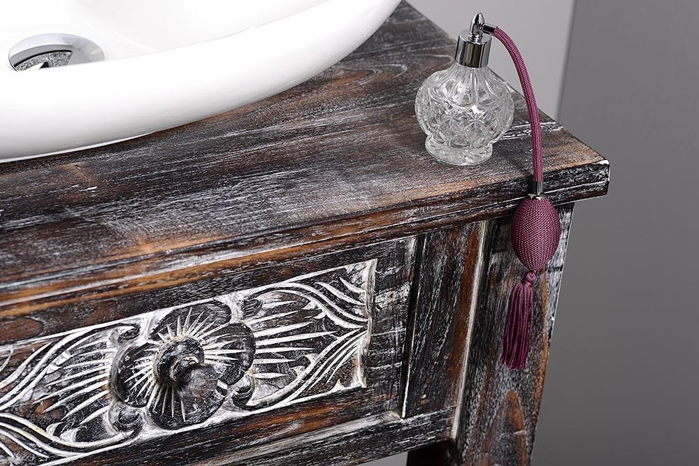 Osobitý charakter skříňky umocňuje zestařený vzhled a kvalita zpracování s důrazem na detail. Dvě zásuvky, zvýrazněné plastickým dekorem vyfrézovaným do dřeva, prakticky doplňuje odkládací polička na ručníky. Neodmyslitelným doplňkem je i zrcadlo ve vyřezávaném rámu, s motivem dekoru sladěným se zásuvkami. Tato kombinace vytváří nádherný interiér s nádechem exotična.