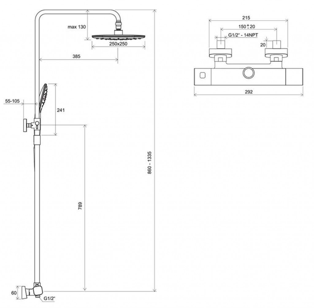 - nástěnná sprchová tyč, variabilní výška: 860-1335 mm, nástěnný držák