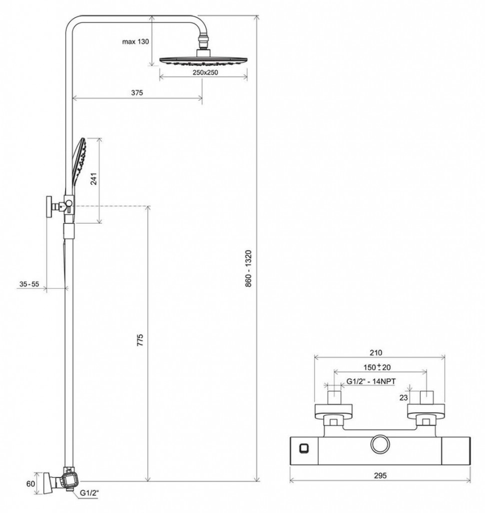 - sprchová hlavice, nástěnná sprchová tyč, variabilní výška: 860-1335 mm, nástěnný držák