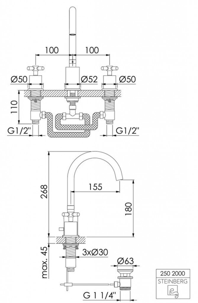 - s výpustí 1 1/4" - ovládání táhlem (bez připojovacích hadic k rohovému ventilu)