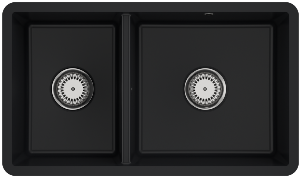 Keramický dřez podstavný dvojitý, bez excentru, barva Pure Black, šířka 75 cm