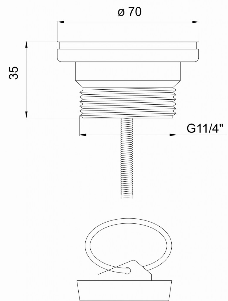 Umyvadlový uzávěr s gumovým špuntem a nerezovou miskou.