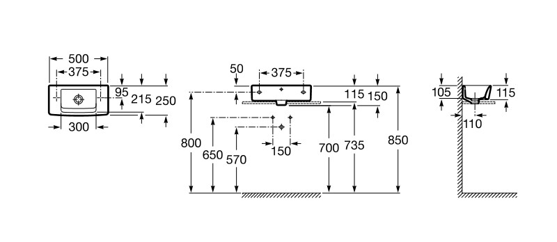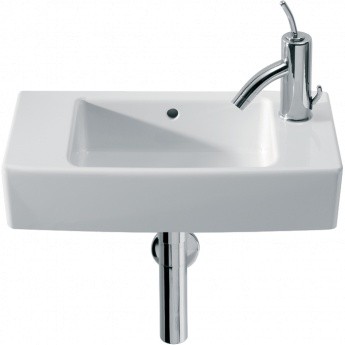 Hranaté umývátko včetně instalační sady, s předvypíchnutým otvorem pro baterii na pravé i levé straně a přepadem.