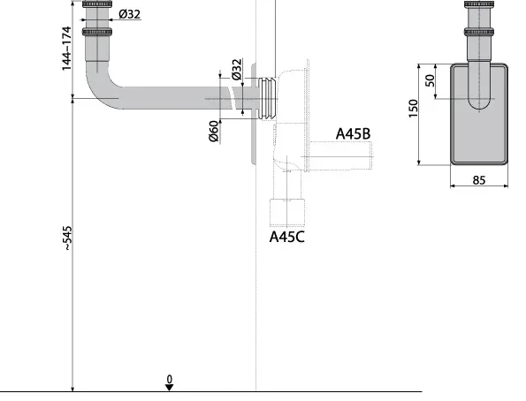 Alcaplast Kovové koleno DN32, 5/4" matice A438; Vlastnosti: Napojení na sifon A45B, A45C; Zvýšená odolnost proti poškrábání; Krycí nerezová deska; Možnost výškového nastavení; Určeno k použití s podomítkovými sifony A45B, A45C; Materiál: pochromovaný kov; Použití: Pro propojení mezi podomítkovým sifonem a umyvadlem; Technické parametry: ; Rozsah dodávky: Kovová trubka; Krytka z nerezu; Manžeta; Matice pro připojení umyvadlové výpusti 5/4"