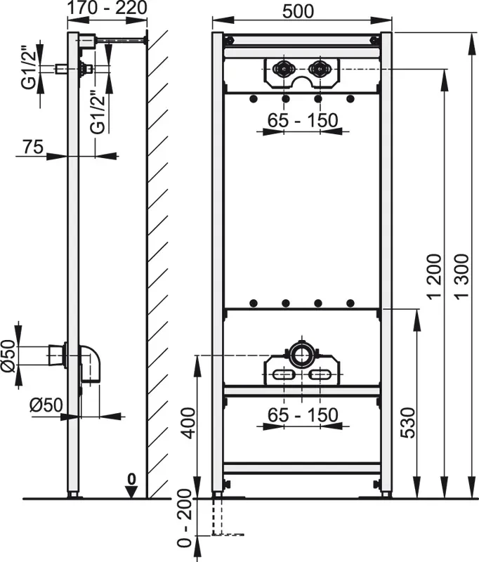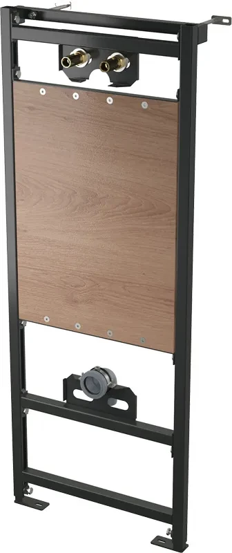Alcaplast Montážní rám pro výlevku a baterii A108/1300; Vlastnosti: Upevňovací deska pro výlevku vyrobená z vodovzdorné lepené překližky; Výškově stavitelné příčky; Pro vyvedení nástěnné armatury; Nastavitelné výsuvné nohy v rozmezí 0-200 mm; Otočná příčka pro uchycení nástěnné armatury s roztečí 65-150 mm; Materiál: kov ošetřený práškovou barvou; Použití: Pro závěsnou výlevku s roztečí kotevních šroubů až do 420 mm; Pro montáž nástěnné armatury; Pro montáž před nosnou stěnu nebo do sádrokartonové konstrukce; Technické parametry: Zátěžová zkouška 150 kg; Rozsah dodávky: Samonosný rám s C-profilem; Kotvicí materiál: vrut 8x60 - 4 ks, hmoždinka 12 - 4 ks; Odpadní koleno HT50 s těsněním; Připojovací šroubení G3/4"-G1/2"