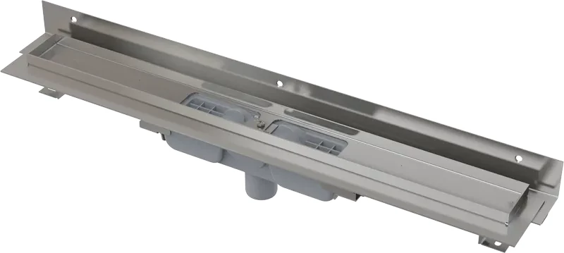 Alcaplast Podlahový žlab s okrajem pro perforovaný rošt a s nastavitelným límcem ke stěně, svislý odtok APZ1104-850; Vlastnosti: Podlahový žlab z nerezové oceli (zušlechtění materiálu mořením a pasivací, elektrochemické přeleštění); Nastavitelný vertikální izolační límec pro obklady o síle 6-12 mm; Stavební výška od 55 mm; Výškově stavitelný; Sifon spojen se žlabem - 100% vodotěsnost; Samolepicí páska pro kvalitní hydroizolaci; Mechanicky čistitelný sifon až po odpadní trubku; Límec a vpust jsou chráněny fólií, vanička polystyrenovou vložkou; Vysoký průtok je umožněn díky dvěma komorám sifonu; Usnadňuje spádování podlahy; Kvalitnější a bezpečnější přechod izolace z podlahy na stěnu; Záruka 25 let; Materiál žlabu: nerezová ocel AISI 304, DIN 1.4301, ČSN 17240; Materiál sifonu: polypropylen; Použití: Pro použití uvnitř budov; Pro dřevostavby a montované stavby; Pro odvodnění sprch v úrovni podlahy; Pro osazení přímo ke stěně; Pro perforované nerez rošty; Pro bezbariérový přístup; Pro místa s omezenou stavební výškou podlah; Technické parametry: Zápachová uzávěra 28 mm; Průtok 32 l/min; Odolnost zápachové uzávěry proti tlaku 575 Pa; Odpadní potrubí průměr 40 mm; Minimální tloušťka betonu 55 mm; Celková stavební výška 70-96 mm; Posun límce 10-12 mm; Třída zatížení K3 300 kg; Rozsah dodávky: Žlab smontovaný se sifonem; Kotvící set: vrut 6x50 - 2 ks, hmoždinka 10 - 2 ks, vrut 4,2x38 - 3 ks, hmoždinka 8 - 3 ks; Samolepicí hydroizolační páska; Ochranná fólie límce žlabu a vtoku sifonu; Instalační kryt koryta; Fixační materiál pro uchycení stavitelných noh: šroub M6x12 - 2 ks