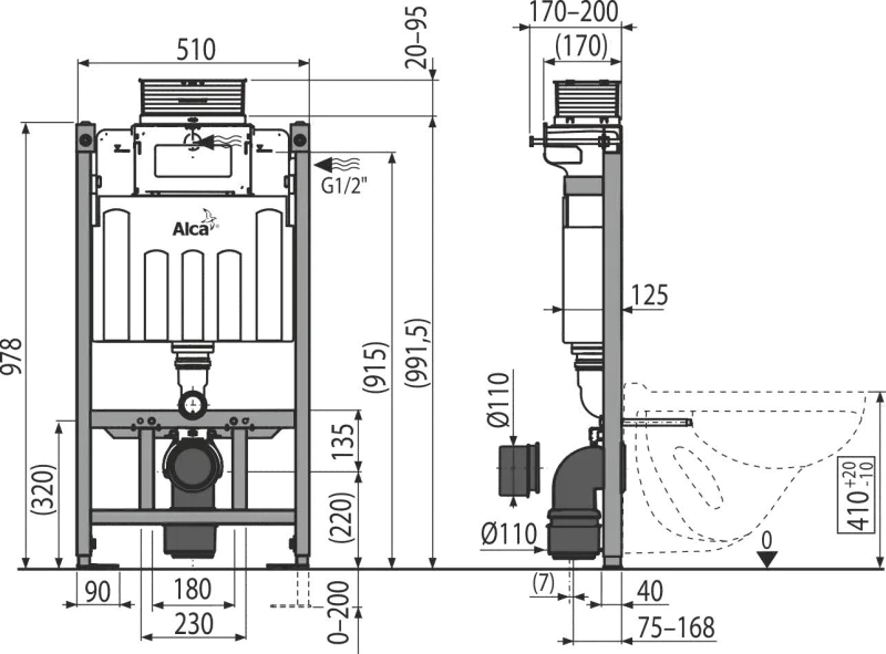 Pro montáž závěsného WC s připojovací roztečí 180 mm nebo 230 mm