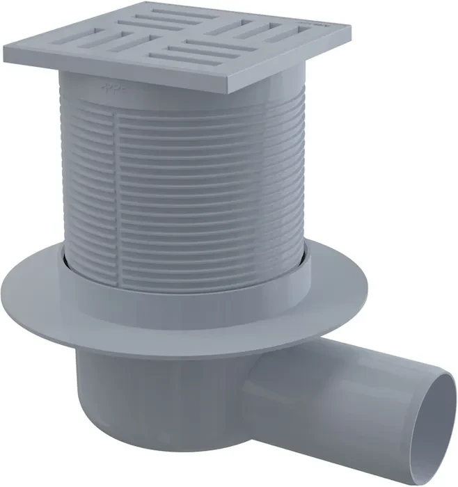 Podlahová vpust 105 × 105/50 boční, mřížka šedá, vodní zápachová uzávěra