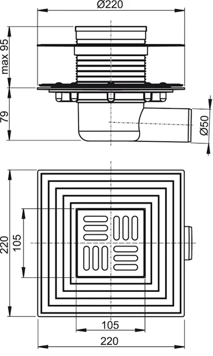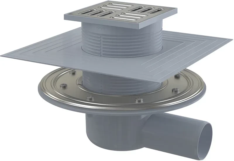 Alcaplast Podlahová vpust 105×105/50 mm boční, mřížka nerez, nerezová příruba a límec 2. úrovně izolace, kombinovaná zápachová uzávěra SMART APV1324; Vlastnosti: Nerezová mřížka 102x102x5 mm; Výškově upravitelné hrdlo 25-95 mm; Široký izolační límec pro napojení na hydroizolaci stavby; Límec 2. úrovně izolace k napojení hydroizolační vrstvy pod dlažbou; Nerezový límec pro pevné přichycení hydroizolační fólie nebo tkaniny hydroizolace stavby; Boční napojení na odpad 50 mm; Mechanicky čistitelný sifon až po odpadní trubku; Kombinovaná zápachová uzávěra SMART; Vodní sloupec a mechanická klapka účinněji zabraňují pronikání zápachu z kanalizace; Kompatibilita s dílci podlahových vpustí včetně vodní, suché a kombinované zápachové uzávěry SMART; Materiál: polypropylen odolný proti mechanickému, chemickému a tepelnému poškození; Použití: Pro vnitřní prostory, kde se neočekává časté využití vpusti (prádelny, kotelny, sklepy); Pro odvodnění v úrovni podlahy; Pro bezbariérový přístup; Technické parametry: Průtok s vtokovou mřížkou 37 l/min; Zápachová uzávěra 30 mm; Třída zatížení K3 300 kg; Rozsah dodávky: Tělo vpusti boční 50 mm; Hrdlo vpusti 105x105 mm; Nerezová mřížka; Kombinovaná zápachová uzávěra SMART; Nerezová příruba + montážní set; Límec 2. úrovně izolace vnitřní 105 mm; Sada těsnění