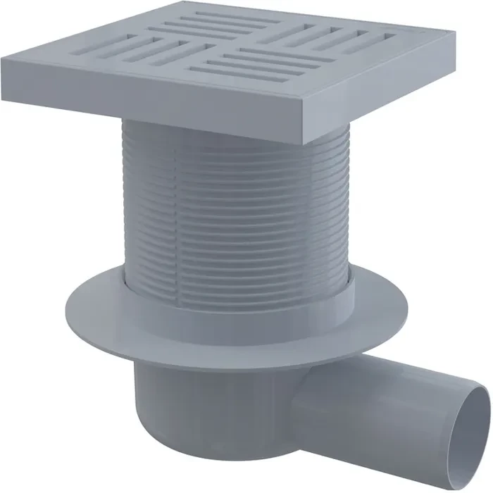 Podlahová vpust 150 × 150/50 boční, mřížka šedá, vodní zápachová uzávěra