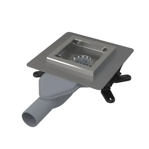 Podlahová vpust nerezová extra-nízká 130×130 mm boční, bez mřížky, Kombinovaná zápachová uzávěra SMART