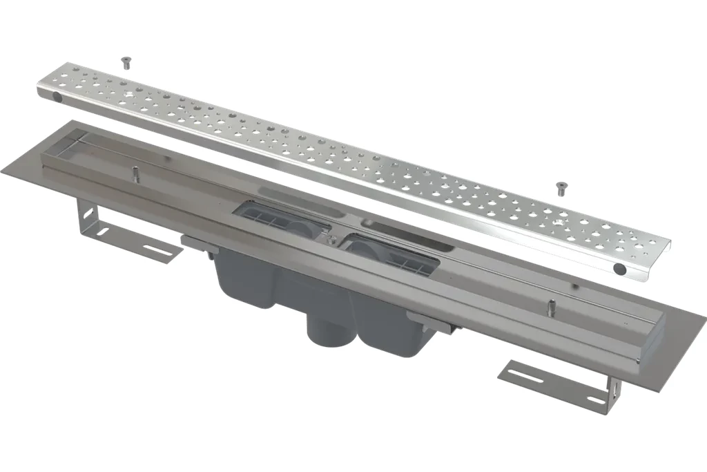 Alcaplast Podlahový žlab Antivandal s roštem, svislý odtok APZ1011-1050L; Vlastnosti: Podlahový žlab z nerezové oceli (zušlechtění materiálu mořením a pasivací, elektrochemické přeleštění); Rošt BUBLE je ke žlabu uchycen pomocí šroubů, aby jej nebylo možno vyjmout bez použití nářadí; Stavební výška od 85 mm; Výškově stavitelný; Sifon spojen se žlabem - 100% vodotěsnost; Samolepicí páska pro kvalitní hydroizolaci; Mechanicky čistitelný sifon až po odpadní trubku; Límec a vpust jsou chráněny fólií, vanička polystyrenovou vložkou; Vysoký průtok je umožněn díky dvěma komorám sifonu; Možnost dokoupení kombinované zápachové uzávěry; Rošt je součástí balení; Záruka 25 let; Materiál žlabu: nerezová ocel AISI 304, DIN 1.4301, ČSN 17240; Materiál sifonu: polypropylen; Použití: Pro použití uvnitř budov; Pro dřevostavby a montované stavby; Pro veřejné prostory; Pro osazení do prostoru nebo blízkosti stěn; Pro odvodnění sprch v úrovni podlahy; Pro bezbariérový přístup; Technické parametry: Zápachová uzávěra 50 mm; Průtok 60-68,8 l/min; Odolnost zápachové uzávěry proti tlaku 982 Pa; Odpadní potrubí průměr 50 mm; Minimální tloušťka betonu 85 mm; Celková stavební výška 100-158 mm; Třída zatížení K3 300 kg; Rozsah dodávky: Žlab smontovaný se sifonem; Kotvící set: vrut 6x50 - 2 ks, hmoždinka 10 - 2 ks; Samolepicí hydroizolační páska; Ochranná fólie límce žlabu a vtoku do sifonu; Instalační kryt koryta; Perforovaný nerezový rošt BUBLE lesk; Fixační materiál pro uchycení stavitelných noh: šroub M6x12 - 2 ks; Fixační materiál pro uchycení roštu: šroub M5x10 - 2 ks