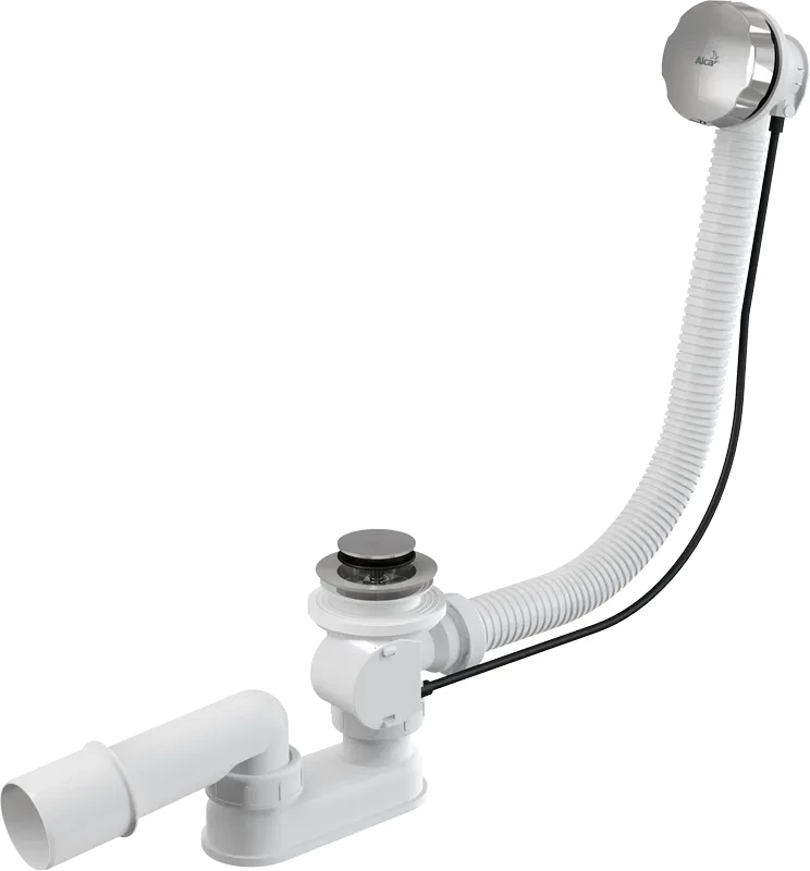Alcaplast Sifon vanový automat komplet, kov A55K-120; Vlastnosti: Vanová odpadová a přepadová souprava; Vodní zápachová uzávěra s otočným kolenem; Uzavírání odpadu pomocí bovdenového ovládání; Flexibilní hadice přepadu; Použití: Pro odtok vody z vany do odpadu; Pro vany standardních rozměrů; Pro vany s odtokovým otvorem 52 mm; Technické parametry: Zápachová uzávěra 50 mm; Průtok 51,6 l/min; Průtok přepad 42 l/min; Odolnost zápachové uzávěry proti tlaku 588 Pa; Tepelný atest 95 st.C; Rozsah dodávky: Tělo sifonu s přepadem; Pochromovaná kovová ovládací hlavice; Pochromovaná kovová zátka; Pochromovaná mosazná mřížka výpusti; Zápachová uzávěra z polypropylenu, tepelně a chemicky odolná, podélně svařovaná; Montážní set; Tvarové těsnění