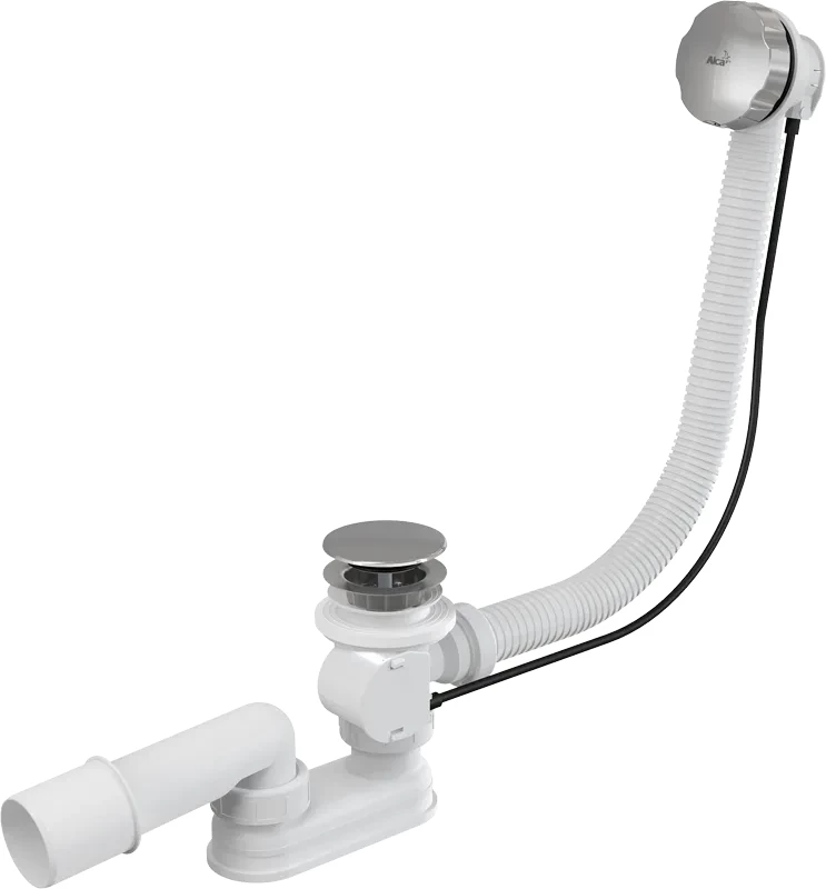 Alcaplast Sifon vanový automat, kov A55KM-120; Vlastnosti: Vanová odpadová a přepadová souprava; Vodní zápachová uzávěra s otočným kolenem; Uzavírání odpadu pomocí bovdenového ovládání; Flexibilní hadice přepadu; Použití: Pro odtok vody z vany do odpadu; Pro vany standardních rozměrů; Pro vany s odtokovým otvorem 52 mm; Technické parametry: Zápachová uzávěra 50 mm; Průtok 51,6 l/min; Průtok přepad 42 l/min; Odolnost zápachové uzávěry proti tlaku 588 Pa; Tepelný atest 95 st.C; Rozsah dodávky: Tělo sifonu s přepadem; Pochromovaná kovová ovládací hlavice; Pochromovaná plastová zátka; Pochromovaná nerezová mřížka výpusti; Zápachová uzávěra z polypropylenu, tepelně a chemicky odolná, podélně svařovaná; Montážní set; Tvarové těsnění