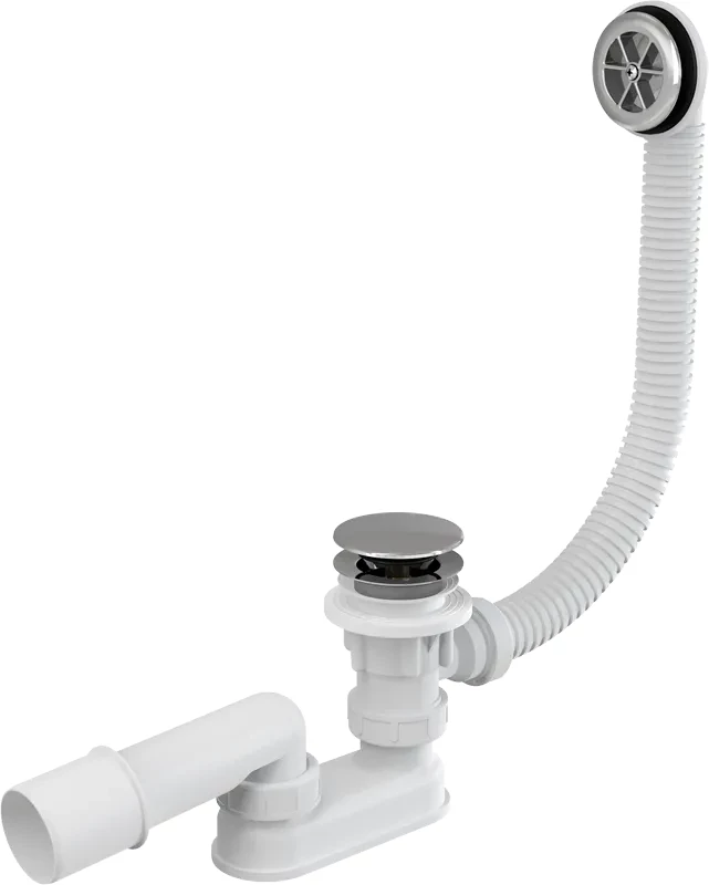 Alcaplast Sifon vanový CLICK/CLACK, chrom A505CRM-120; Vlastnosti: Vanová odpadová a přepadová souprava; Vodní zápachová uzávěra s otočným kolenem; Uzavírání odpadu pomocí systému CLICK/CLACK; Flexibilní hadice přepadu; Použití: Pro odtok vody z vany do odpadu; Pro vany standardních rozměrů; Pro vany s odtokovým otvorem 52 mm; Technické parametry: Zápachová uzávěra 50 mm; Průtok 48,6 l/min; Průtok přepad 42 l/min; Odolnost zápachové uzávěry proti tlaku 588 Pa; Tepelný atest 95 st.C; Rozsah dodávky: Tělo sifonu s přepadem; Pochromovaná plastová mřížka přepadu; Pochromovaná plastová zátka; Pochromovaná plastová výpust; Zápachová uzávěra z polypropylenu, tepelně a chemicky odolná, podélně svařovaná; Montážní set; Tvarové těsnění