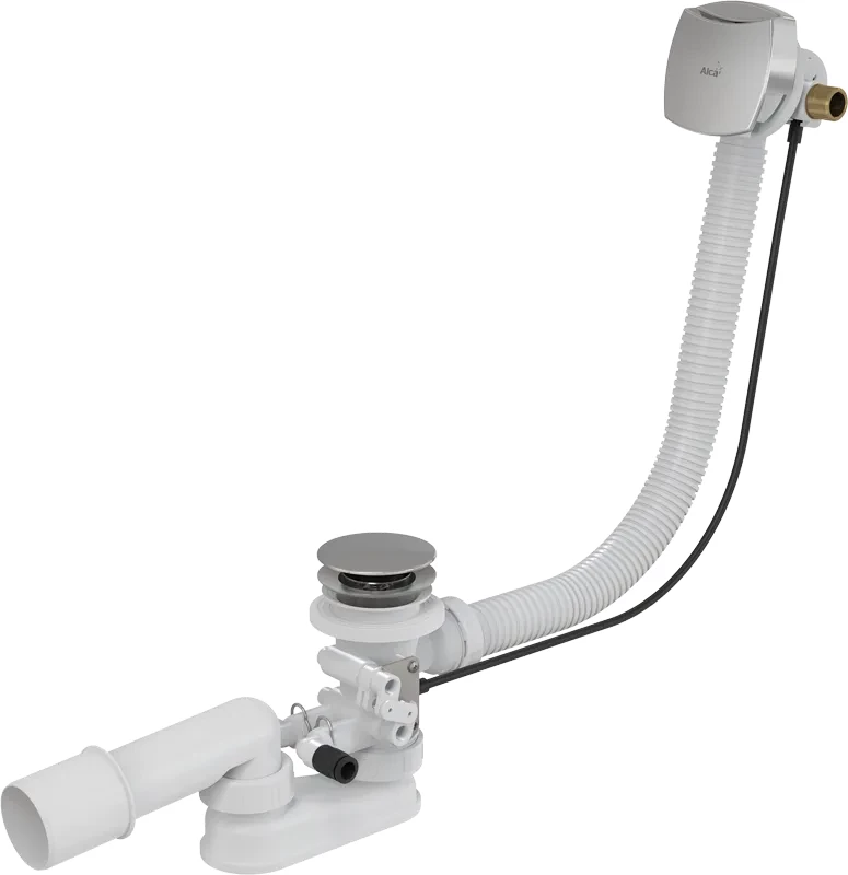 Alcaplast Sifon vanový s napouštěním přepadem pro hydromasážní vany, kov A566-273133-80; Vlastnosti: Součástí sifonu je mechanismus, který při otevření výpusti současně otevře ventily, kterými odtéká zbytková voda ze systémů masážní vany; Kompatibilní na většinu hydromasáží a aerosystémů; Pro napojení slouží dva odtoky - standardní kolínko; Perlátor Neoperl - jednoduchý přístup a výměna; Ovládací oska z nerezové oceli; Voda neteče po stěně vany a nezanechává tak na ní mapy; Minimální zástavní prostor do vany - viditelná pouze ovládací hlavice; Vodní zápachová uzávěra s otočným kolenem; Uzavírání odpadu pomocí bovdenového ovládání; Flexibilní hadice přepadu; Boční G1/2" šroubení pro přívod předem namixované vody; Použití: Pro napouštění vany přepadem; Pro odtok vody z vany do odpadu; Pro hydromasážní vany; Pro vany s odtokovým otvorem 52 mm; Technické parametry: Zápachová uzávěra 50 mm; Průtok 48,6 l/min; Průtok přepad 33,6 l/min; Odolnost zápachové uzávěry proti tlaku 588 Pa; Tepelný atest 95 st.C; Rozsah dodávky: Vanová přívodní, odpadová a přepadová souprava; Tělo sifonu s napouštěním, přepadem a mechanismem pro vypouštění HMS; Šroubení s rychlospojkou pro napojení HMS 2 ks; Pochromovaná kovová ovládací hlavice; Pochromovaná kovová zátka; Pochromovaná mosazná mřížka výpusti; Zápachová uzávěra z polypropylenu, tepelně a chemicky odolná, podélně svařovaná; Montážní set; Tvarové těsnění