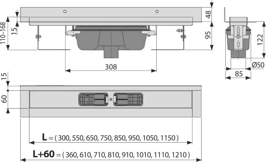 Alcaplast Podlahový žlab s okrajem pro plný rošt a s pevným límcem ke stěně, svislý odtok APZ1016-750; Vlastnosti: Podlahový žlab z nerezové oceli (zušlechtění materiálu mořením a pasivací, elektrochemické přeleštění); Pro vkládání plných roštů - nerez, kalené sklo, syntetický kámen, rošt pro vložení dlažby a hranolový rošt; Stavební výška od 95 mm; Výškově stavitelný; Sifon spojen se žlabem - 100% vodotěsnost; Samolepicí páska pro kvalitní hydroizolaci; Mechanicky čistitelný sifon až po odpadní trubku; Límec a vpust jsou chráněny fólií, vanička polystyrenovou vložkou; Vysoký průtok je umožněn díky dvěma komorám sifonu; Možnost dokoupení kombinované zápachové uzávěry; Záruka 25 let; Materiál žlabu: nerezová ocel AISI 304, DIN 1.4301, ČSN 17240; Materiál sifonu: polypropylen; Použití: Pro použití uvnitř budov; Pro odvodnění sprch v úrovni podlahy; Pro osazení do blízkosti stěn; Pro plné rošty, rošt FLOOR na vložení dlažby a hranolový rošt GAP; Pro bezbariérový přístup; Technické parametry: Zápachová uzávěra 50 mm; Průtok 60-68,8 l/min; Odolnost zápachové uzávěry proti tlaku 982 Pa; Odpadní potrubí průměr 50 mm; Minimální tloušťka betonu 95 mm; Celková stavební výška 110-168 mm; Třída zatížení K3 300 kg; Rozsah dodávky: Žlab smontovaný se sifonem; Kotvící set: vrut 6x50 - 2 ks, hmoždinka 10 - 2 ks; Samolepicí hydroizolační páska; Ochranná fólie límce žlabu a vtoku do sifonu; Instalační kryt koryta; Fixační materiál pro uchycení stavitelných noh: šroub M6x12 - 2 ks