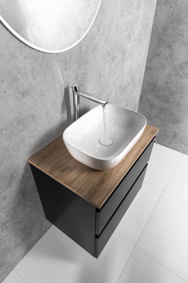 Koupelnový nábytek ALTAIR s deskou ALTAIR (HPL) v dekoru dub emporio a antracit břidlice platin lze kombinovat s umyvadly na postavení.