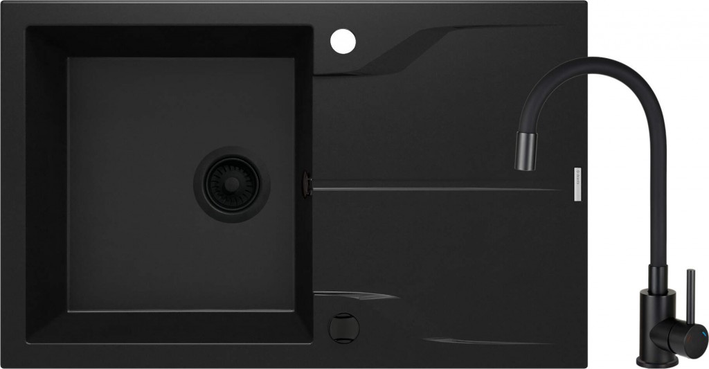 Granitový dřez s baterií tvoří kompletní kuchyňskou sestavu. Je vyrobena z odolné přírodní žuly, která je odolná nejen vůči vysoké teplotě a jejím výkyvům, ale i nárazům a změně barvy, v souladu s evropskou normou PN-EN 13310. Navíc je obohacena o hydrofobní vrstvu, která usnadňuje tok jednotlivých kapek. Ve stejné barvě je také vodovodní baterie s pohodlnou výlevkou. Praktický 1-miskový dřez s odkapávačem je perfektním řešením pro malé kuchyně a studia s kuchyňským koutem. Slouží i jako sušák, profilovaný povrch účinně odvádí vodu stékající z nádobí nebo umytých potravin.