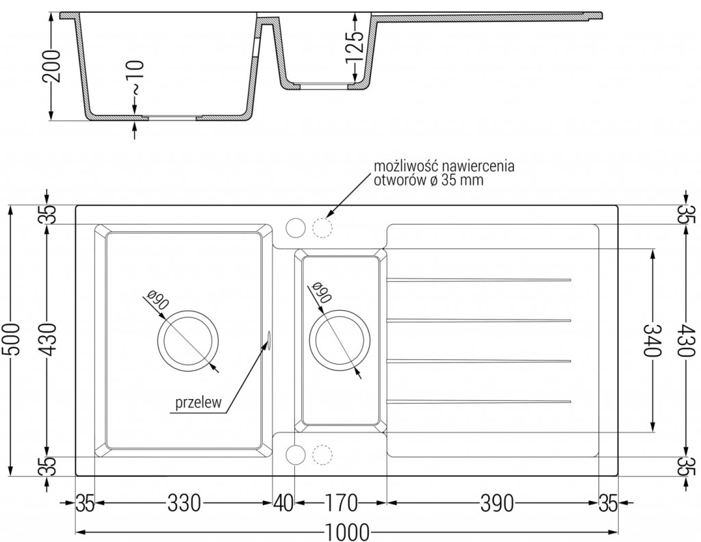 - odtokový otvor: 3,5 ”; fi = 90 mm