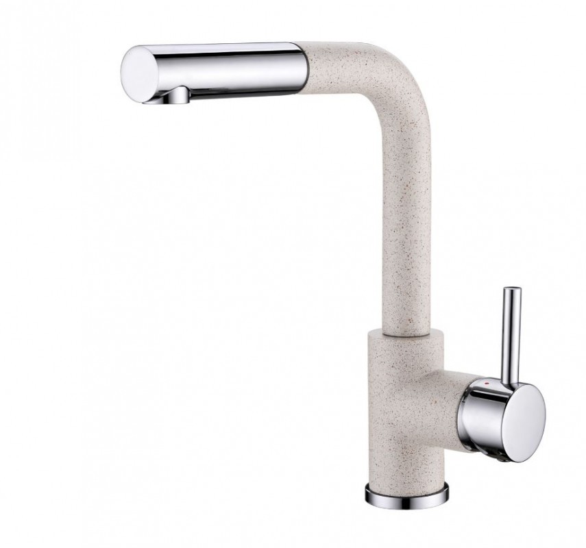 Povrch dřezové baterie je vyroben z drcené žuly. Černá granitová baterie, ale také písková, bílá nebo šedá skvěle doplní granitový dřez v podobných odstínech. Samozřejmě je možné tuto pákovou baterii použít i u dřezů nerezových, kde ozvláštní celkový dojem mycího centra.