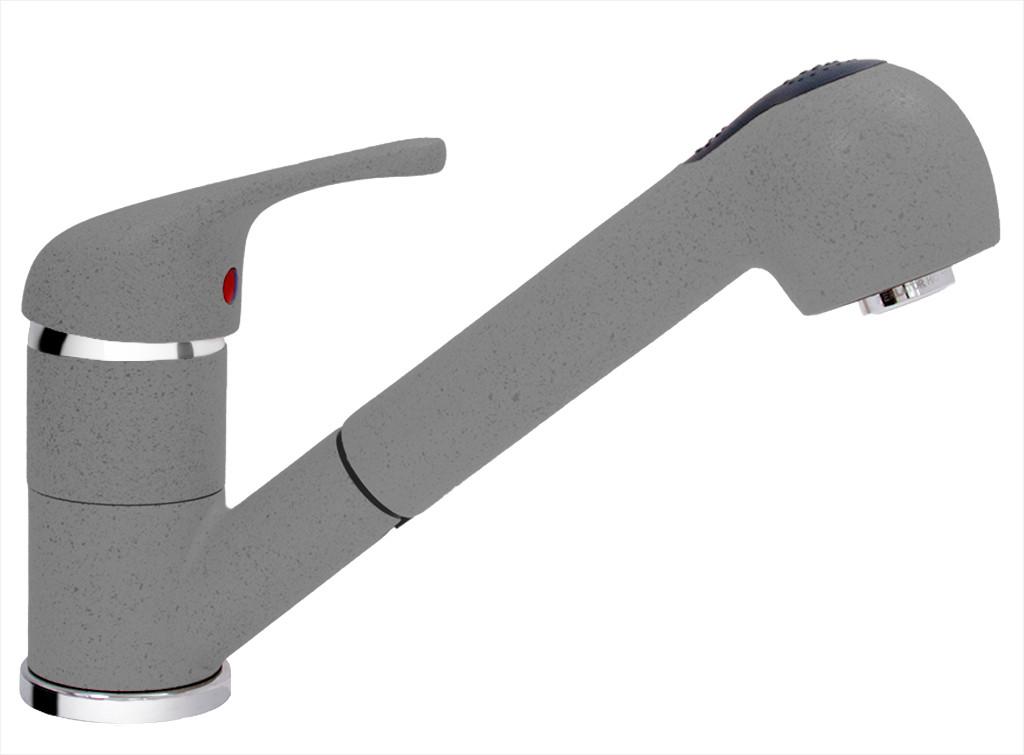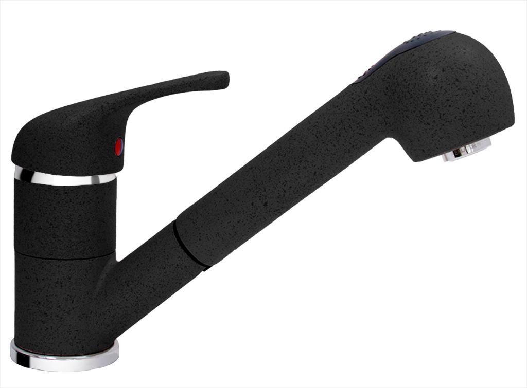 Povrch dřezové baterie je vyroben z drcené žuly. Černá granitová baterie, ale také písková, bílá nebo metalická skvěle doplní granitový dřez v podobných odstínech. Samozřejmě je možné tuto pákovou baterii použít i u dřezů nerezových, kde ozvláštní celkový dojem mycího centra.