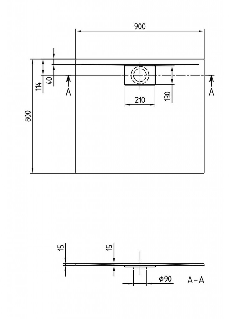 - hloubka v místě odtoku: 15 mm