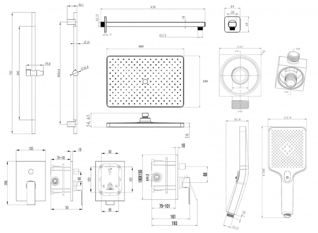 horní sprchu 360 x 240 mm se sprchovým ramenem 430 mm