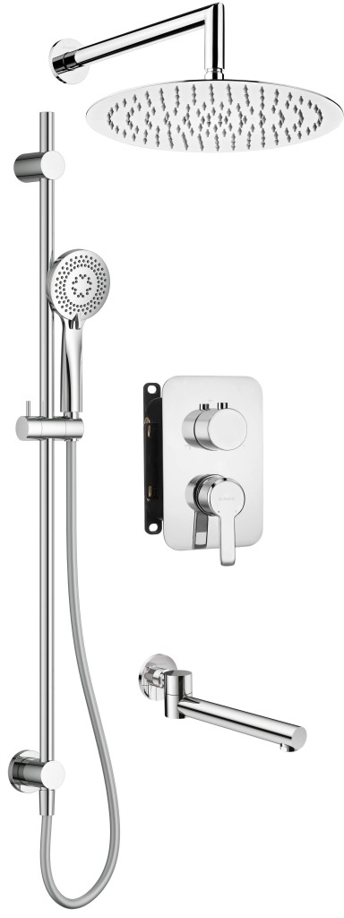 Sprchový set pod omítku má všechny potřebné prvky k vybavení sprchy. Vysoká kvalita použitých materiálů mnohokrát testovaných v laboratorních podmínkách zajišťuje bezporuchový provoz. Inovativní design a elegantní povrchová úprava upoutá pozornost a zapuštěná instalace opticky zvětšuje prostor. Minimalistické řešení umožňuje získat prostor například pro přídavnou polici na kosmetiku nebo věšák. Díky tomu můžete snáze a rychleji uklidit celou místnost. Sada má směšovací BOX, kde si můžete sami nastavit teplotu protékající vody podle svých potřeb.