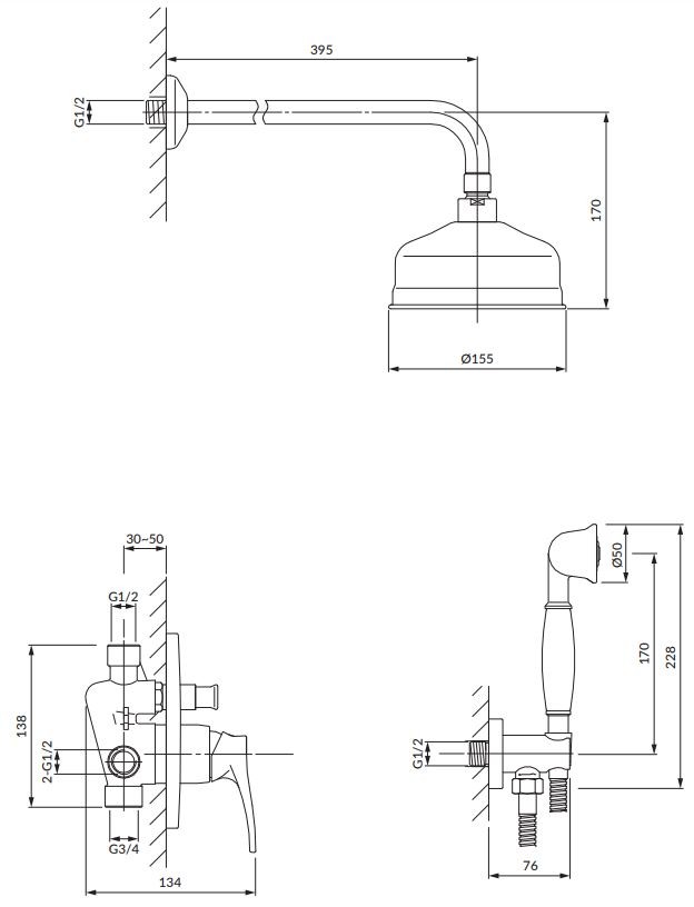 - podomítková sprchová a vanová baterie (AD5135ORB)) - velikost rozety: ø17 cm, dva vstupy (pro horkou a studenou vodu): 1/2", dva výstupy smíšené vody: 1/2" a 3/4"