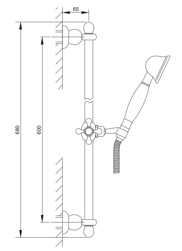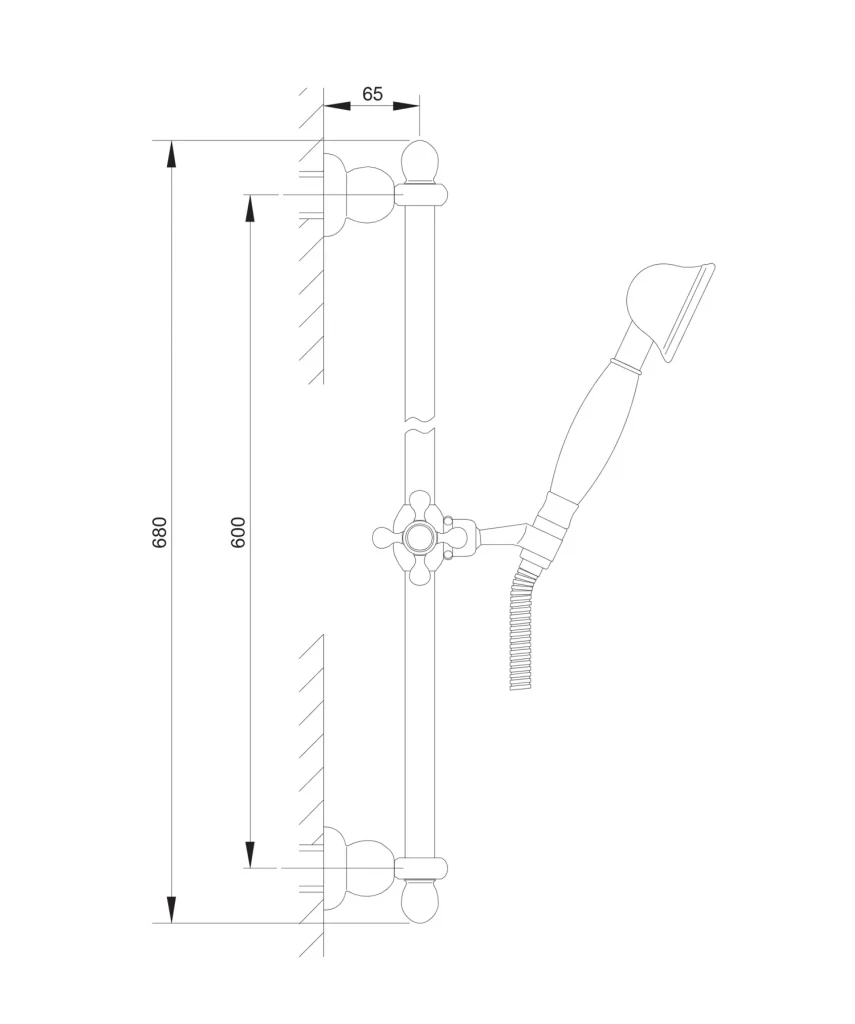• mosazná sprchová tyč, délka: 68 cm, montážní rozteč: 60 cm, s posuvným jezdcem