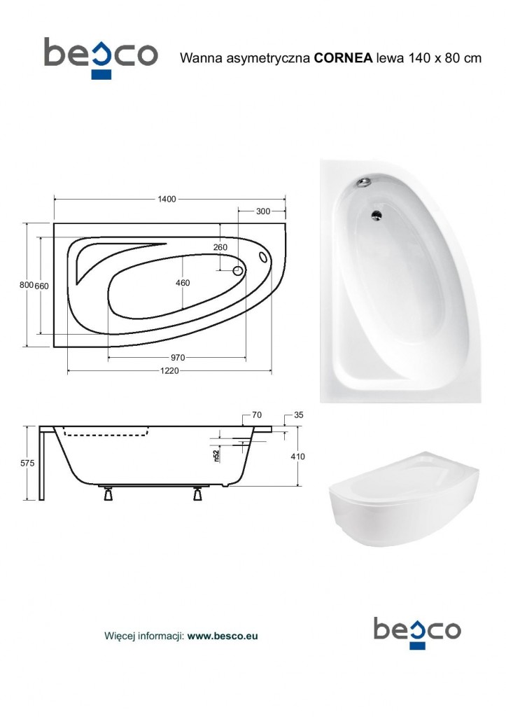 Asymetrická rohová vana CORNEA je vyrobena z kvalitního sanitárního akrylátu, který uspokojí i ty nejnáročnější požadavky, navíc s praktickým sedátkem. Vana s atraktivní hloubkou 41 cm poskytuje dostatek místa a pohodlí i tam, kde jste si to zatím nemohli dovolit.