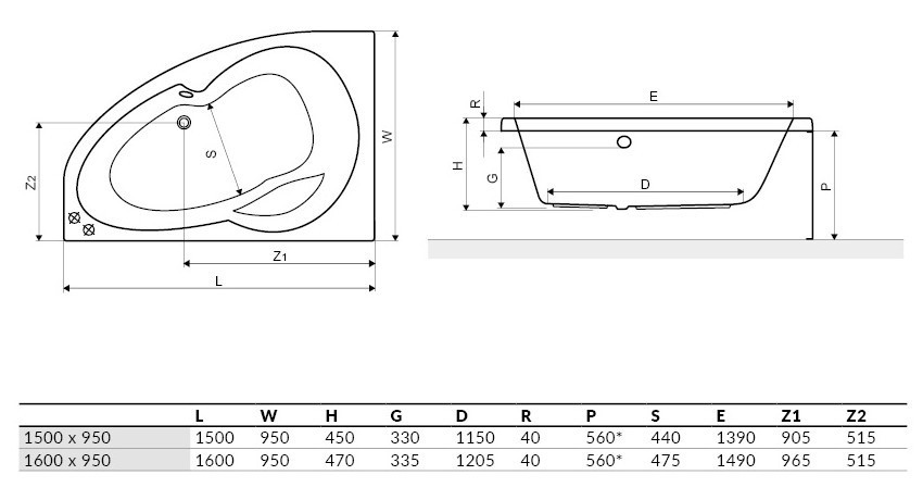 | Varianta | 1600 × 950 mm, objem 160 l |