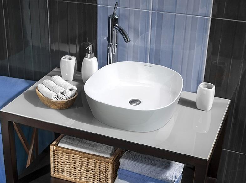 Keramické umyvadlo se zaoblenými rohy bez otvoru pro baterii.
