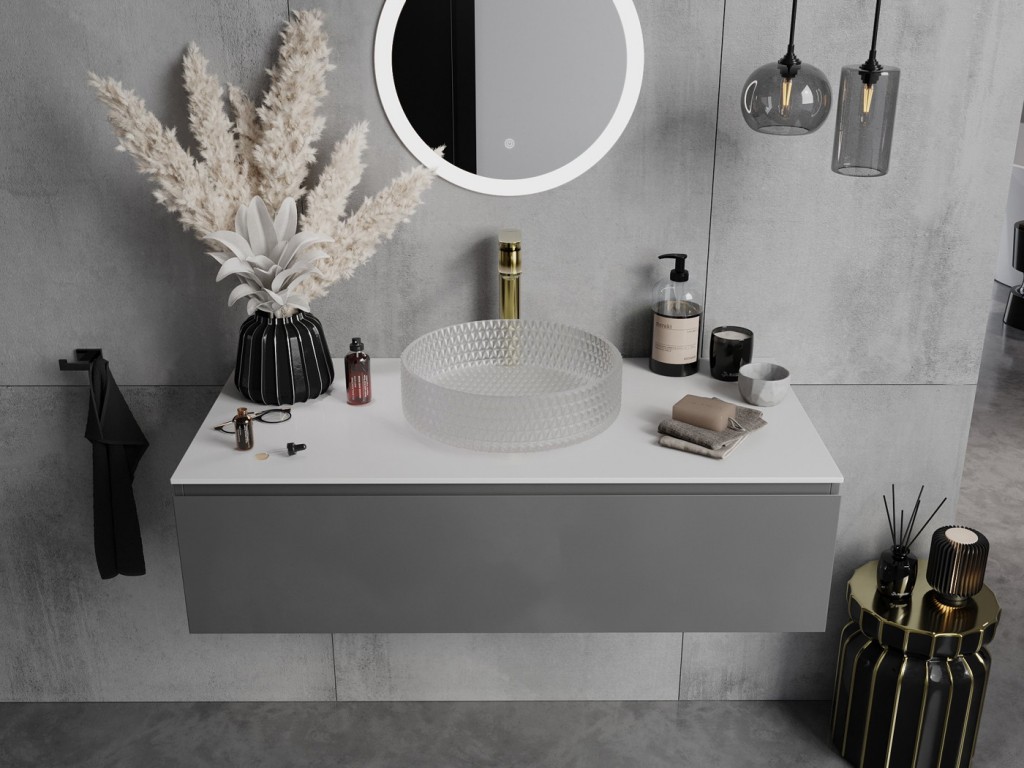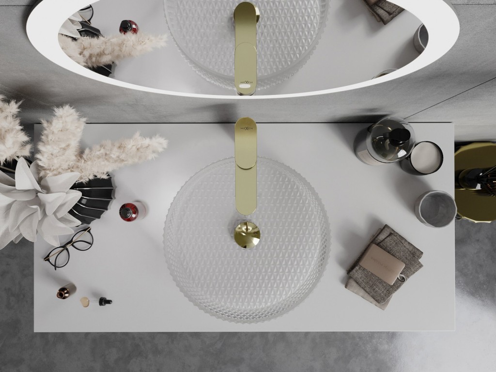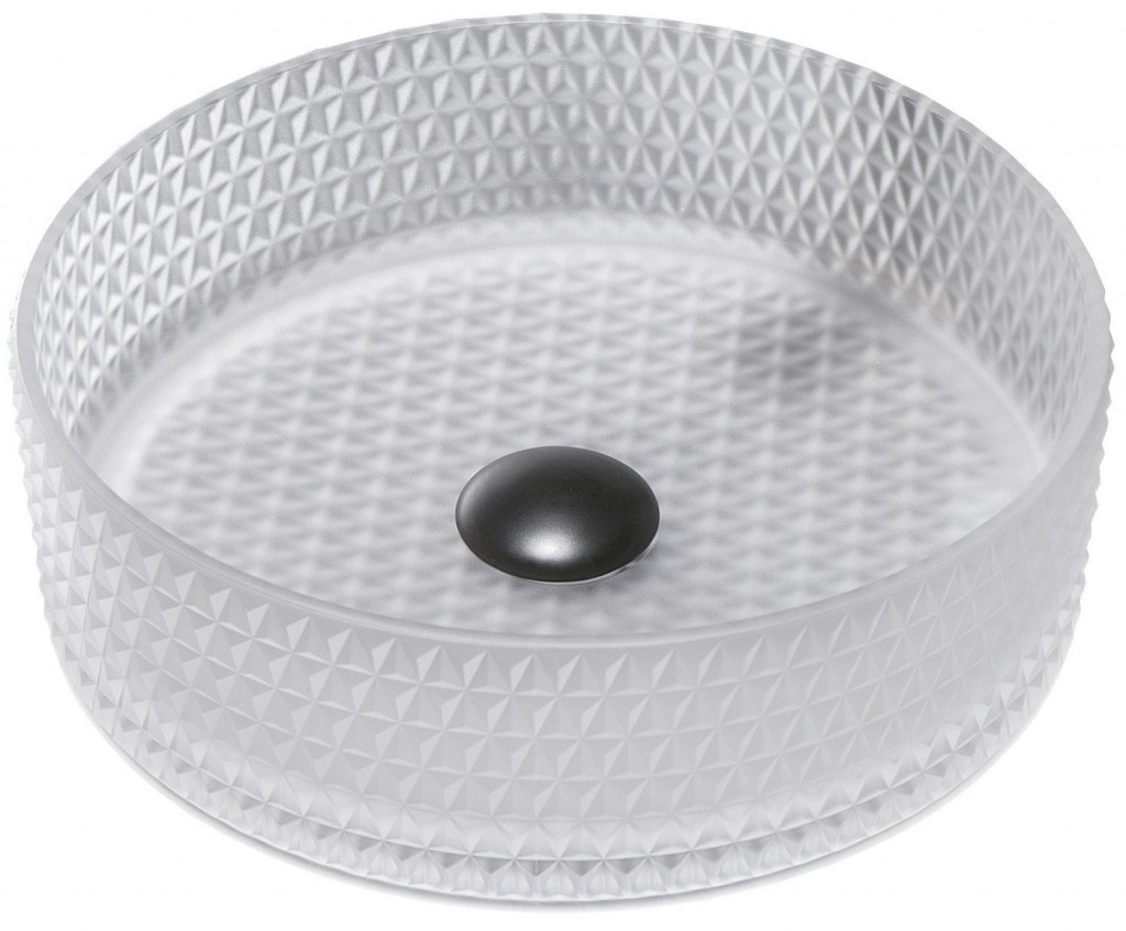 Skleněné umyvadlo AURA je vyrobeno z odolného skla se vzory připomínající křišťálový lustr. Nabízí velmi netradiční vzhled, který odráží dopadající světlo všemi směry.