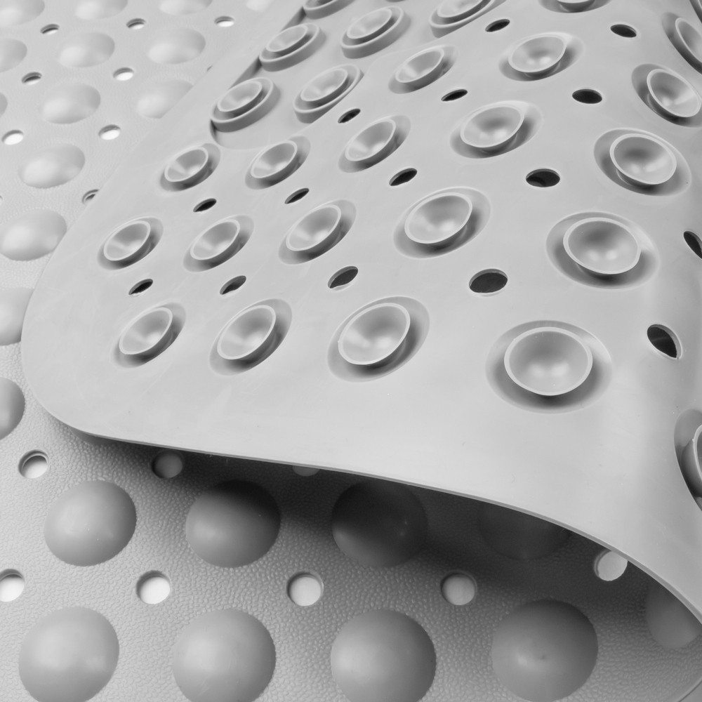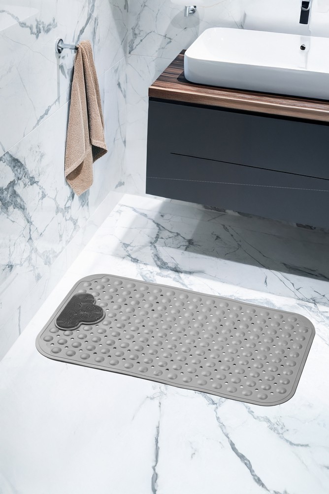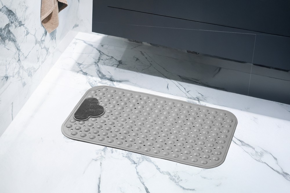 Popis: Protiskluzová podložka AWD INTERIOR 2019 v šedé barvě kombinuje bezpečnost, funkčnost a pohodlí. Vyrobena z vysoce kvalitního PVC, je odolná, odolná vůči vlhkosti a snadno se čistí. Její perforovaný povrch s vyvýšenými kruhovými vzory umožňuje efektivní odtok vody a zároveň si zachovává stylový a moderní vzhled. Díky silným protiskluzovým přísavkám drží podložka bezpečně na místě na vanách i sprchových koutech. Neutrální šedý odstín z ní dělá perfektní doplněk do moderních i klasických koupelen. Další výhodou je vestavěná masážní zóna s hustými výstupky, které jemně stimulují chodidla a nabízejí relaxaci a pohodlí během koupání.
