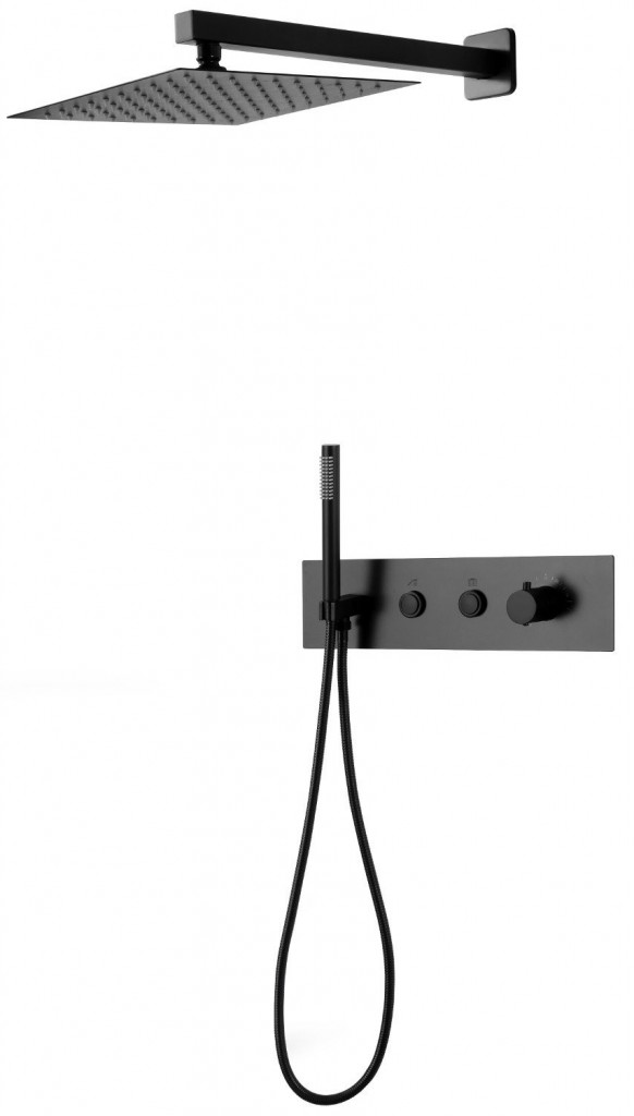 Sprchová sada se skládá z hlavové sprchy s dešťovým proudem a ruční 1-funkční sprchy. Hadice s nerezovým krytem má délku 150 cm. Celé provedení je v elegantní černé barvě. Díky silikonovým tryskám Anti-Calc je čištění od vodního kamene snadné.
