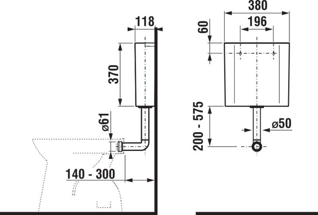 Nádrž je vyrobena ze silnostěnného plastu o tloušťce 4-5 mm, odolného vůči UV záření a díky tomu si zachovává stejnou bílou barvu jako keramické klozety. Nádrž můžete díky nastavitelnosti (200-575) umístit v různé výšce.