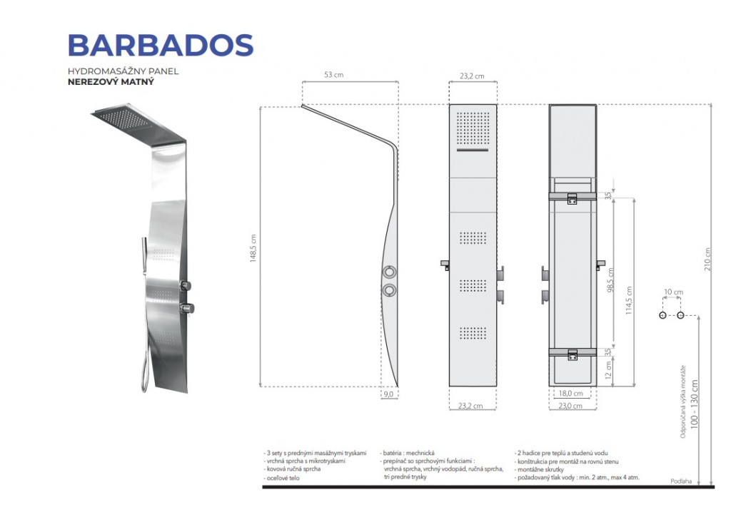 Také prostřednictvím hydromasážního panelu BARBADOS vytvoříte luxusní sprchový prostor. Hydromasážní sprchové panely mají vrchní sprchu, která je pevná a spodní sprchu, která je spojena s panelem chromovou flexibilní hadicí. Funkce panelu se programují pomocí regulátoru. Silnějším pootočením se otevírá a zavírá přívod vody, slabším pootočením se mění jednotlivé funkce. K montáži nepotřebujete žádná speciální zařízení. Jednoduše jej připojíte flexibilními hadicemi pro přívod teplé a studené vody.
