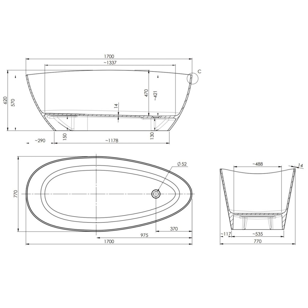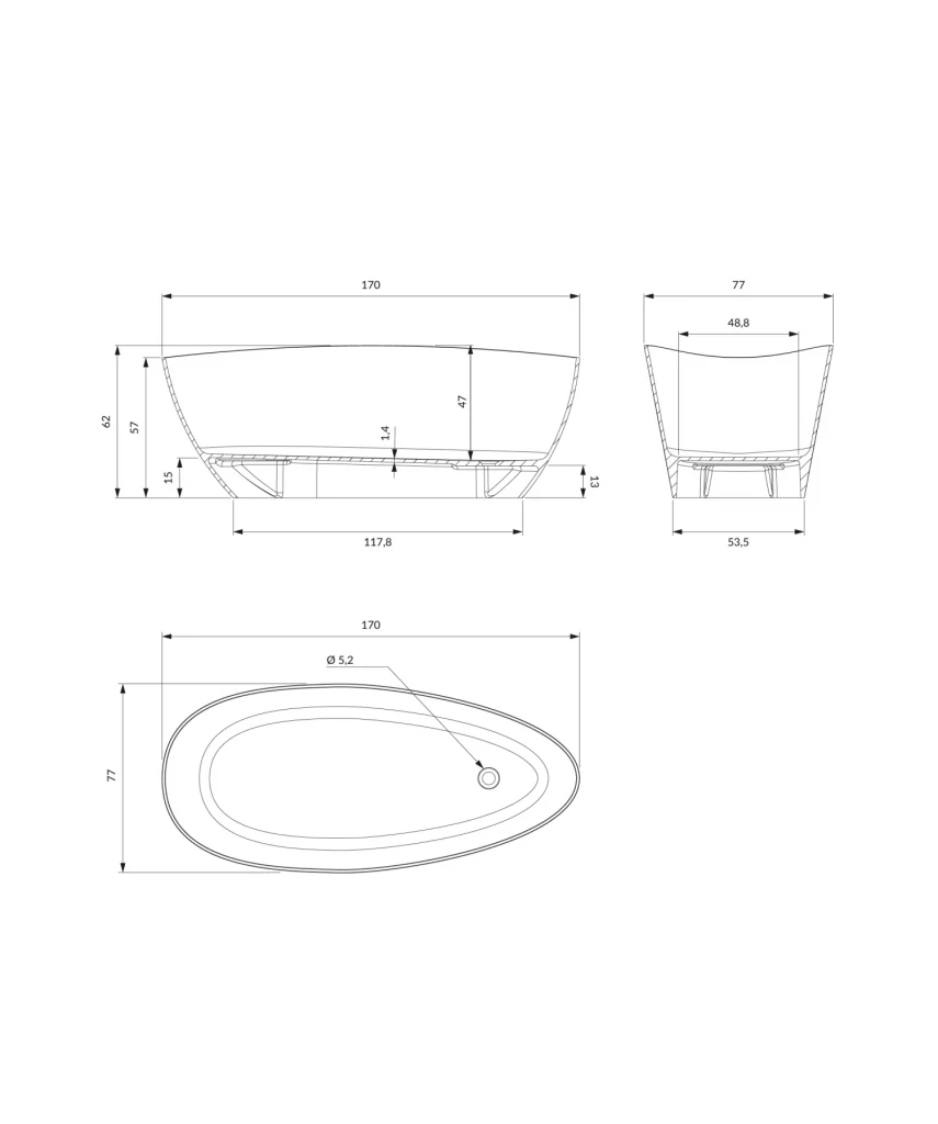 Vana je dlouhá 170 cm a v nejširší části určené pro opření má 77 cm. U nohou je zúžená a je zde umístěný odtok. Výška vany je 62 cm. Součástí vany není vanová zátka. Výrobce nabízí vanovou zátku se sifonem v několika barevných variantách. Můžete vybrat zde.