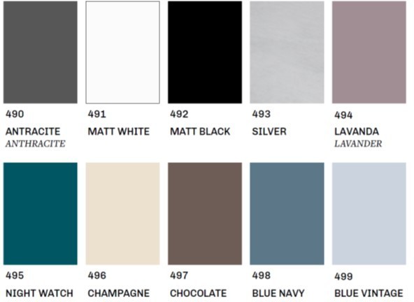 | Barva | Blue navy,Blue vintage,Anthracite,Matt white,Matt black,Silver,Lavanda,Night watch,Champagne,Chocolate |